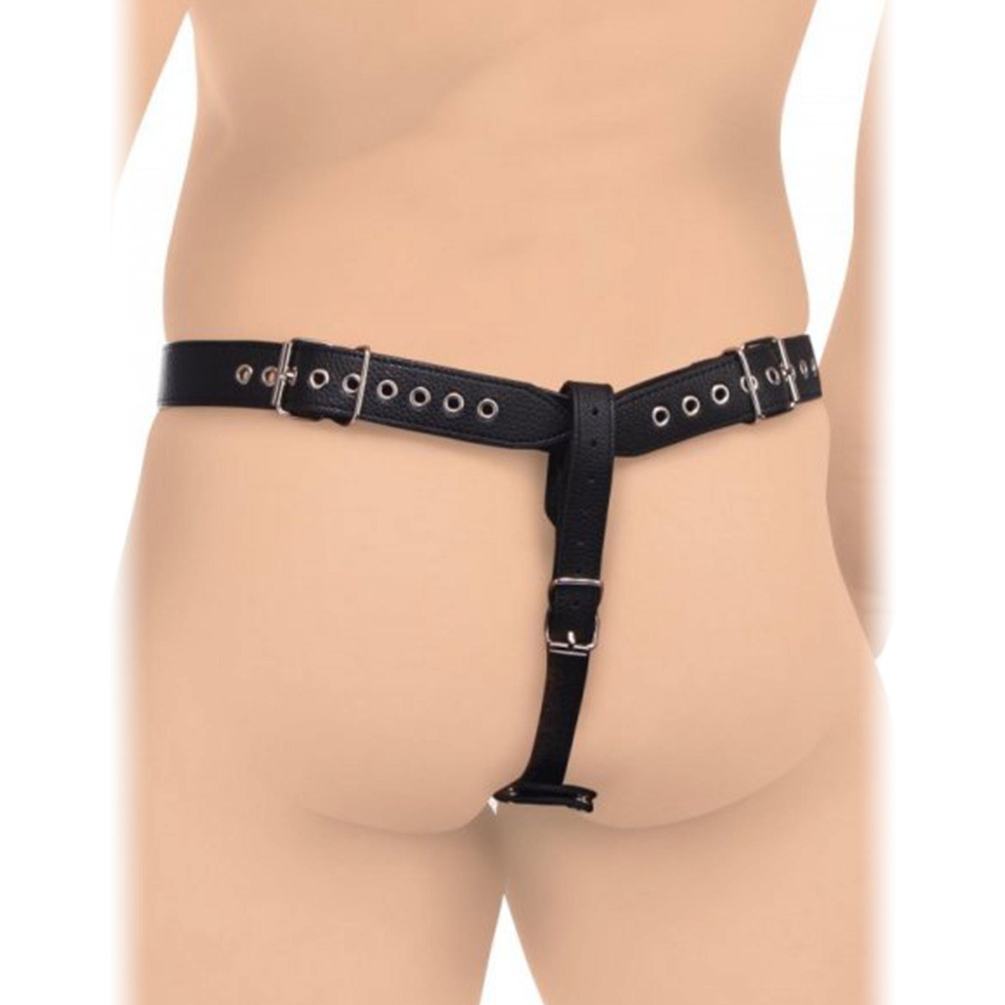 Restrain their sexuality with our Strict Male Chastity Harness with Silicone Anal Plug! Wrap their cock in the 4 adjustable black leather straps straps to physically and mentally restrain them, firmly placing them under your protection and ownership. The included removable velvety silicone anal plug fits securely in the crotch strap, penetrating your sub's asshole while they are strapped in! This harness is fully adjustable at the waist and the crotch strap so you can find the perfect fit for your unique body. It's perfect for wearing during at-home scenes or for short romps on the town, all the while your lover's package remains restrained until they earn their freedom.
