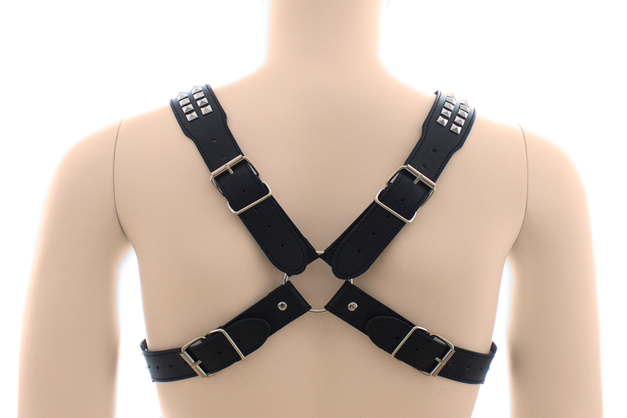 This studded Halford style cross-chest harness is simple and eye-catching, perfect for a fetish house party, local club, or bedroom. Looks great on men or women! Made out of PVC vegan leather, this harness has smooth straps that cross over the chest to accentuate your chest.