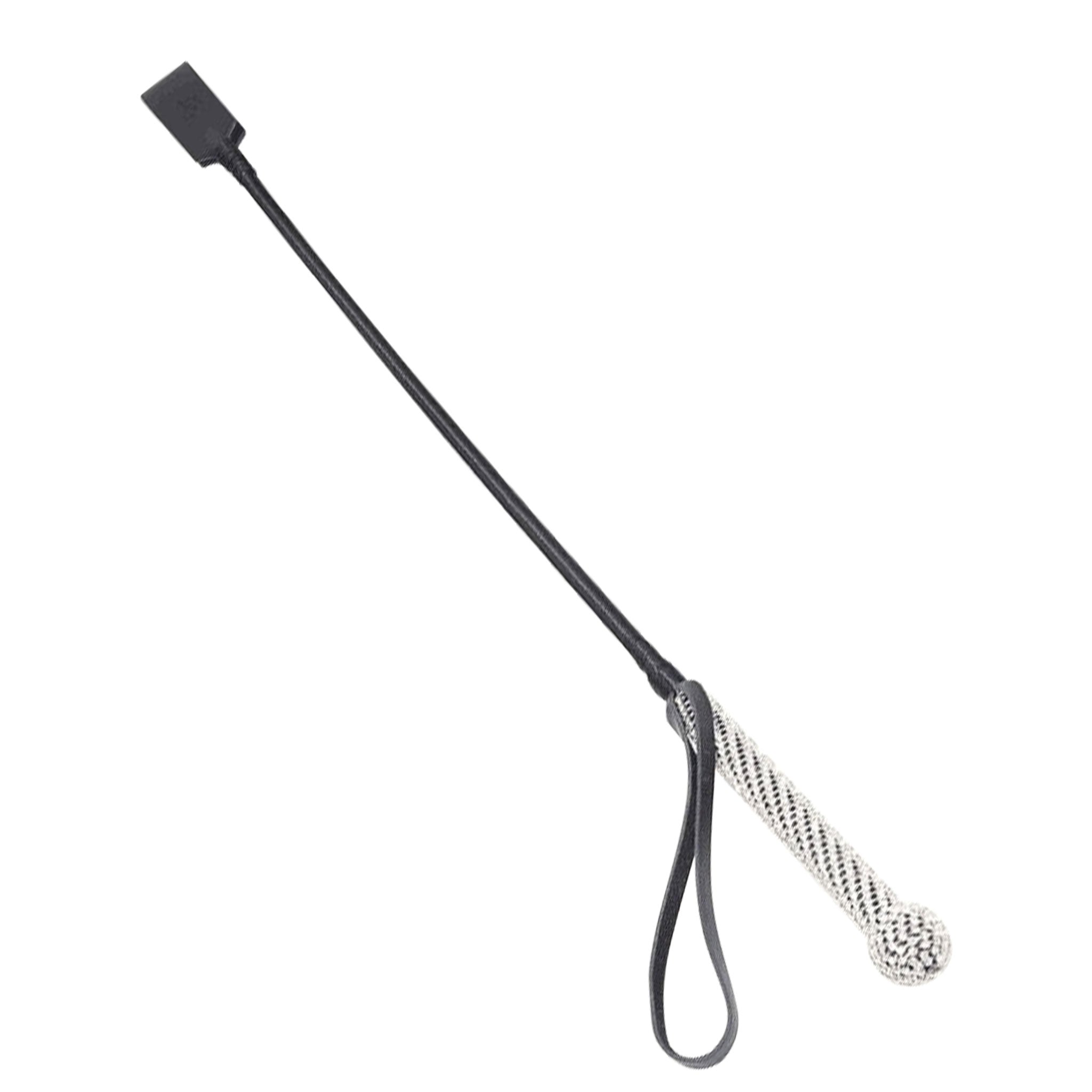 Get your lovers and subs up to speed with our Rhinestone Handle Riding Crop! The flexible shaft covered in braided vegan leather bends with the force of your swing, and the sound its hollowed out popper tip makes is sure to have them rearing back in pleasure! Pleasing to the eye is the rhinestone-encrusted handle grip, adding a fancy bit of flash to your fetish play. The handle loop is great for hanging up from pegs in your dungeon or keeping this amazing bedroom weapon close at hand.